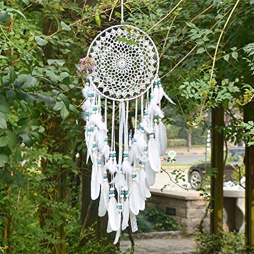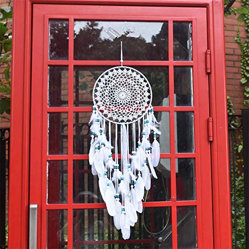 EasyBravo Grand Boho - Sensore di sogni con piume bianche e perle blu macramé da appendere alla parete vintage per matrimoni, decorazione domestica, 20 cm, cerchio 70 cm lungo