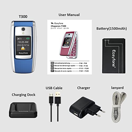 Easyfone T300 4G Telefono Cellulare per Anziani, Cellulare con apertura a conchiglia, Tasti Grandi, Volume alto, tasto SOS e base di ricarica (Blu)