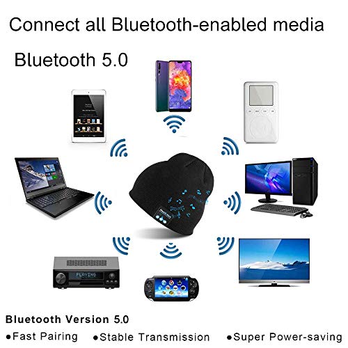 Cappello Bluetooth e Cuffie 2 in 1, l'ultima tecnologia Bluetooth V5.0+EDR, cappello Bluetooth facilmente collegarsi a tutti i dispositivi Bluetooth abilitati lettori multimediali, connessione più veloce, la più stabile, Il design speciale del cappello Bluetooth wireless consente di ascoltare musica e conversazioni telefoniche.