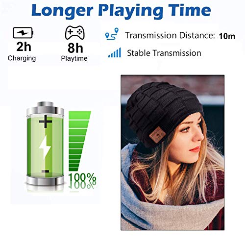 Disponibile per la maggior parte dei dispositivi con funzione bluetooth. distanza di trasmissione wireless fino a 10m. Anche i controlli sul lato sono facili da usare! con batteria Li-on integrata da 200 mAh, il cappello a cuffia deve essere caricato solo 2 ore, può essere utilizzato fino a 8 ore durante l'ascolto della musica.
