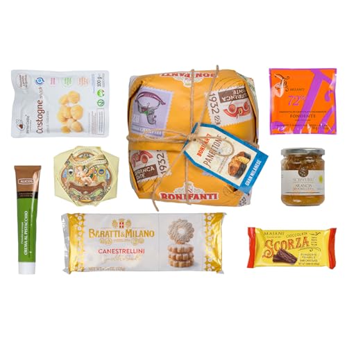 7 PRODOTTI: all'interno potrai trovare sette prodotti dolcissimi e gustosi: Tavoletta di Cioccolato 72% 50g di T'A Milano, la Crema di Pistacchio in Tubetto 100g di Alicos, Castagne Morbide 100g de La Frutticola, Scorza di Cioccolato Fondente 25g di Majani, Panettone 500g di Bonifanti, Canestrelli 125g di Baratti & Milano e Marmellata di Arance 220g di Scyavuru.