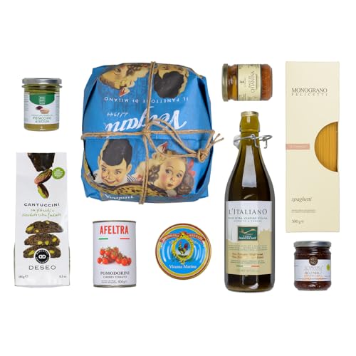 9 PRODOTTI: all'interno di questo cesto regalo troverai: Confettura Extra di Fichi Neri 220g di Scyavuru, Spaghetto Cappelli 500g del Pastificio Felicetti, Olio L'Italiano Rustico 1l di Terre Francescane, Pomodorini Afeltra 400g di Afeltra, Ragù di Chianina 180g de Il Vallino, Cantucci con Pistacchio e Cioccolato Fondente 180g di Deseo, Crema di Pistacchi di Sicilia 200g di Antica Bronte Dolceria, Panettone Milano 1Kg di Vergani e Trancio di Tonno 266g di Vicente Marino.