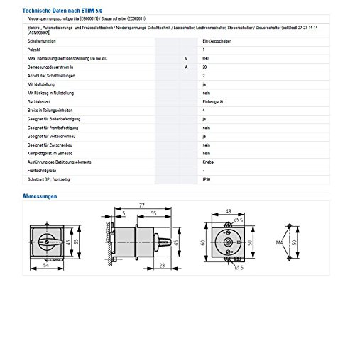 Interruttore on/off, contatti: 1, 20 a, scudo anteriore: 0 - 1, 45 °, rastend, deviatore