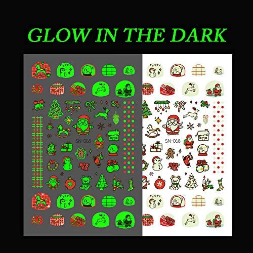Tema Natale Luminoso: 12 adesivi per unghie natalizi luminosi che possono brillare al buio e assorbire energia luce, tra cui albero di natale, campana, fiocco di neve, babbo natale, pupazzo di neve, renna, pinguino, caramelle, fiori, calzino e tanti disegni invernali.