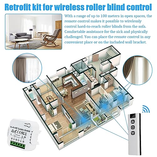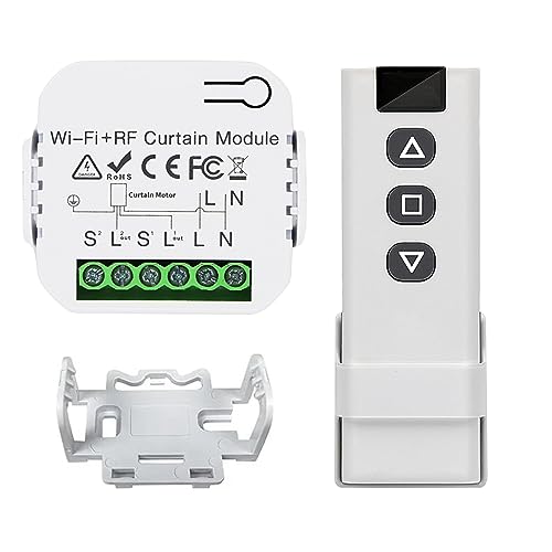 Interruttore per tapparelle con telecomando, facile da installare, facile da usare e facile da imparare. Telecomando già in fabbrica nel ricevitore. Il modulo interruttore WiFi si adatta a qualsiasi presa standard da incasso. Basta collegare il modulo all'interruttore desiderato per tapparelle, ricevitore con corrente e l'interruttore e il motore collegati, quindi iniziare con il telecomando.