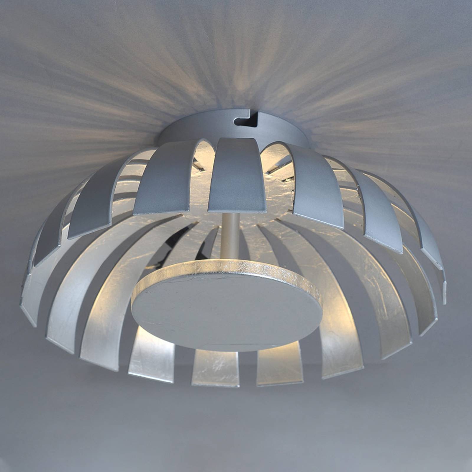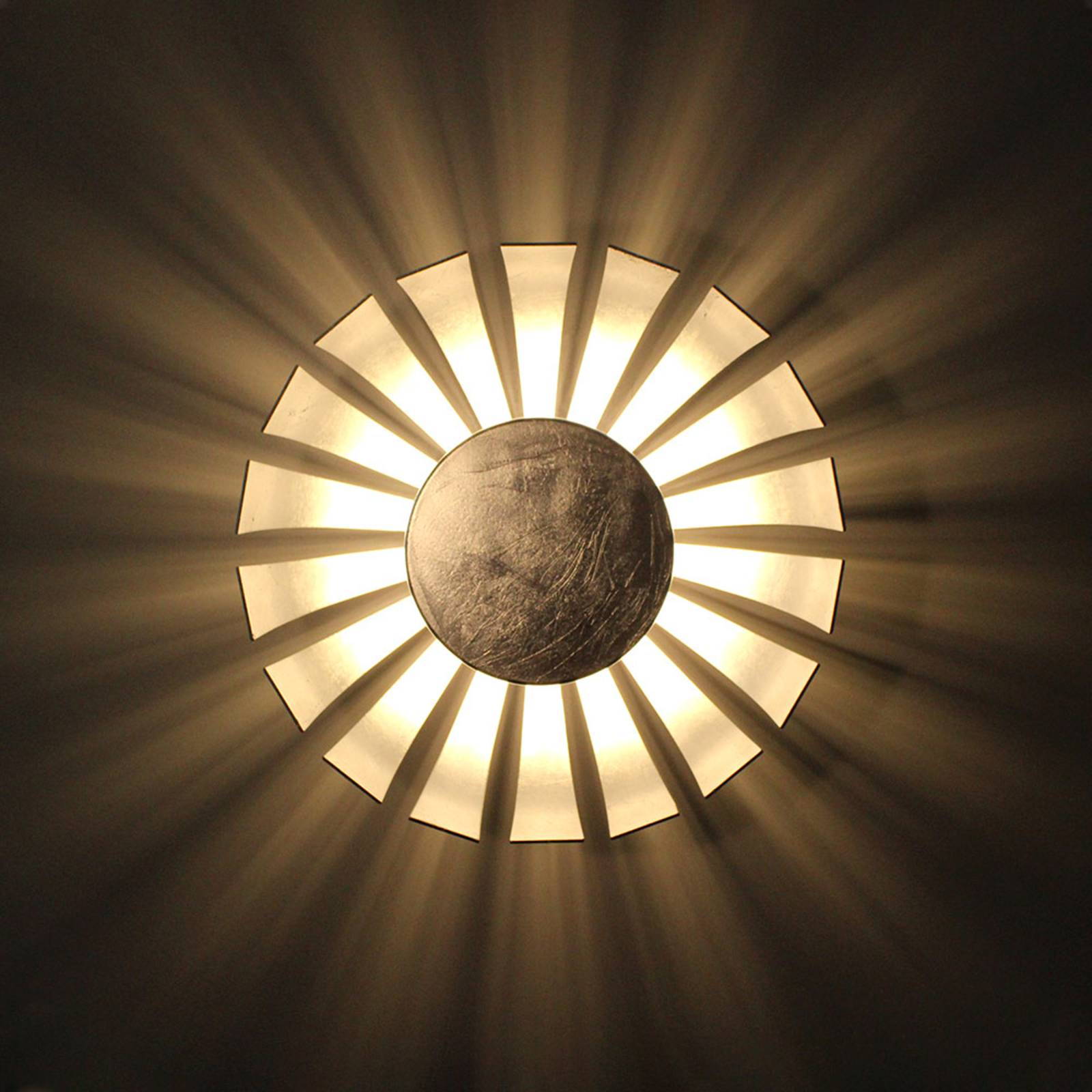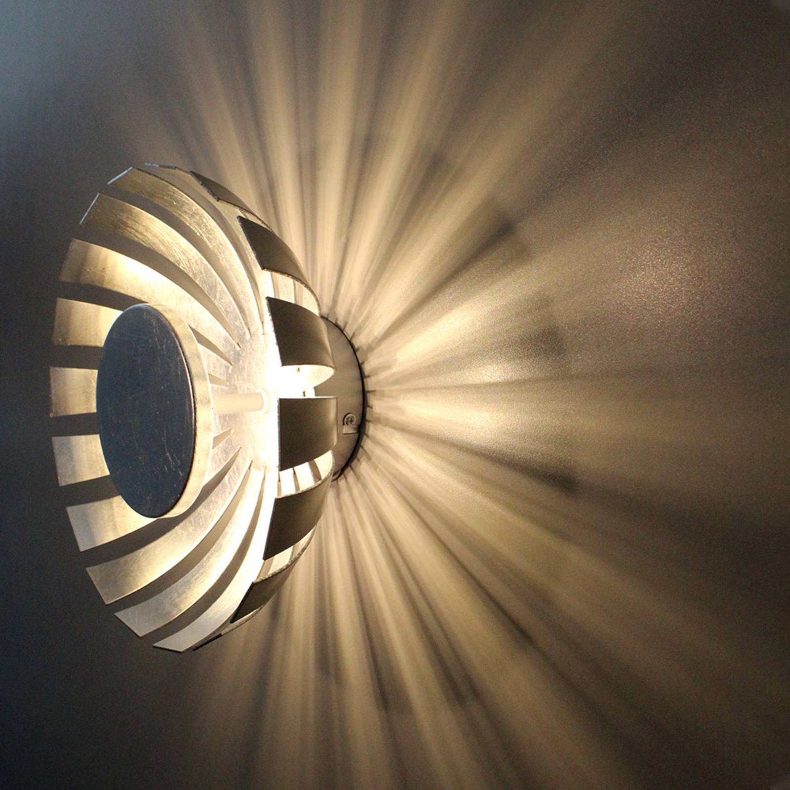 Lampada da parete a LED color argento Flare con effetto ombra radiale La tonalità semicircolare dell'apparecchio da parete Flare LED a LED a parete viene interrotta in modo radiale, in modo che quando la luce viene accesa, si crea un grande effetto di fascio sulla parete. Al centro del paralume, la lampada è posizionata verso il muro e illumina solo il paralume e attraverso le fessure il muro. Così la luce indiretta è creata dal riflesso del paralume e della parete, creando un'atmosfera accogliente. Il design dell'apparecchio è piuttosto neutro e quindi si adatta a molti interni diversi. L'apparecchio può essere montato anche a soffitto, se lo si desidera.