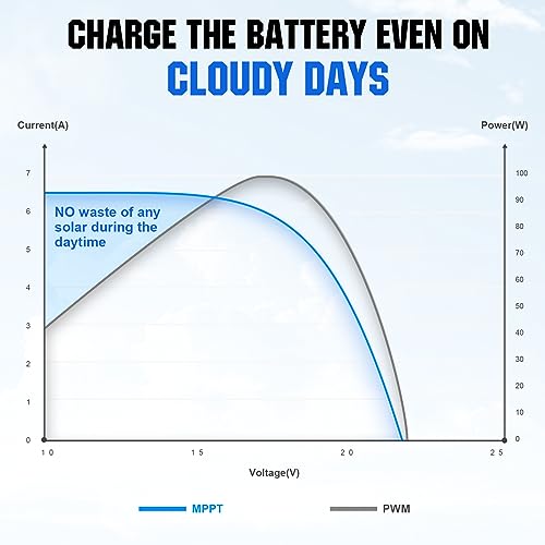 【Tecnologia MPPT efficiente al 99%】 Tecnologia di tracciamento dei punti di potenza massima con un'elevata efficienza di tracciamento fino al 99% e un'efficienza di conversione di picco del 98%, 40% in più rispetto ai tradizionali controller di carica PWM. Può mantenere una corrente di carica stabile anche nelle giornate nuvolose e non spreca la luce solare.