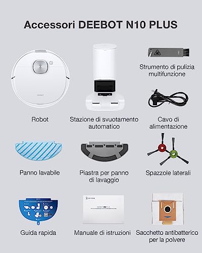 ECOVACS DEEBOT N10 PLUS Robot Aspirapolvere e Lavapavimenti, 4300Pa, Stazione SvuotaPolvere Automatica, 400m², Rilevamento Tappeti, Pulizia Personalizzata, Peli di Animali, Mappe 3D