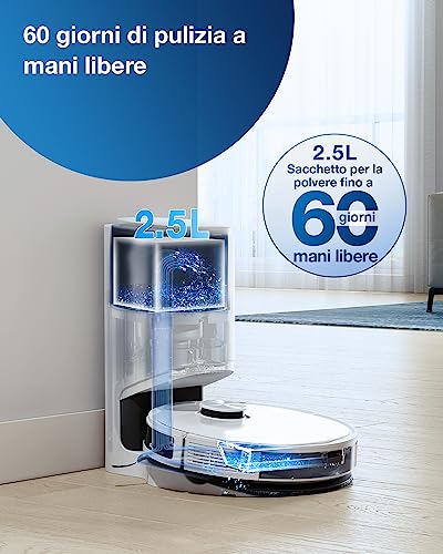 STAZIONE DI SVUOTAMENTO AUTOMATICO DA 2,5L: mani libere fino a 60 giorni, riduce drasticamente la necessità di pulire frequentemente il sacchetto della polvere. La stazione può essere controllata in modo intelligente dall'App ECOVACS Home;