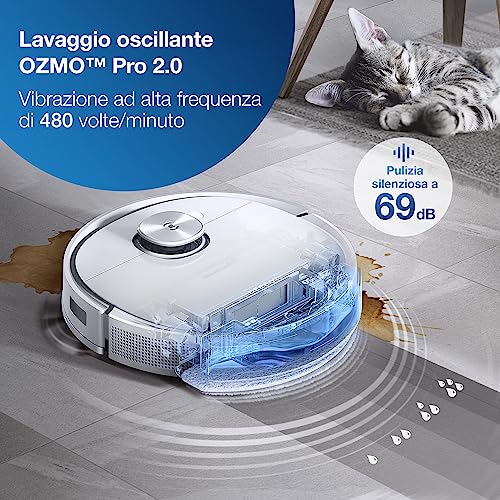 ECOVACS Deebot T9+ Robot Aspirapolvere Lavapavimenti con Mappatura, Stazione Di Svuotamento Automatico, Spazza Aspira Lava, 3000 Pa, Rilevamento Ostacoli 3D, Ottimo per Peli Animali Domestici, Bianco