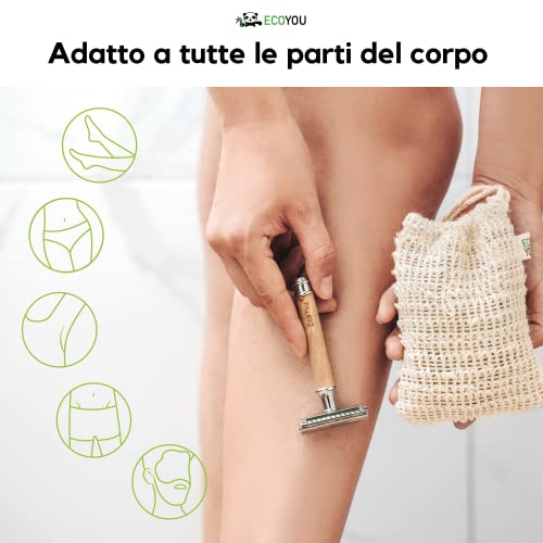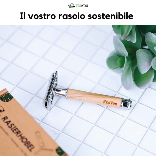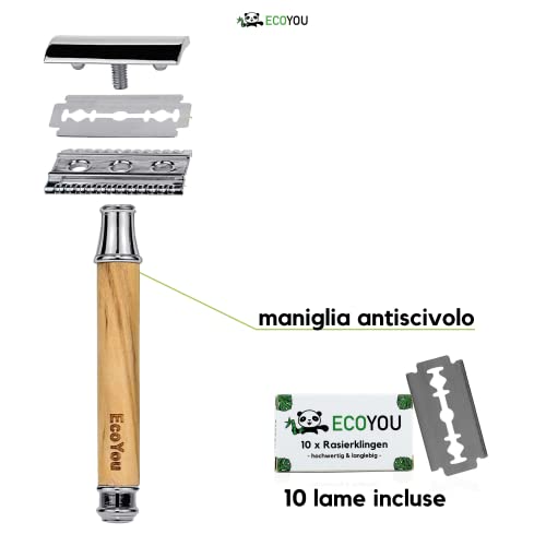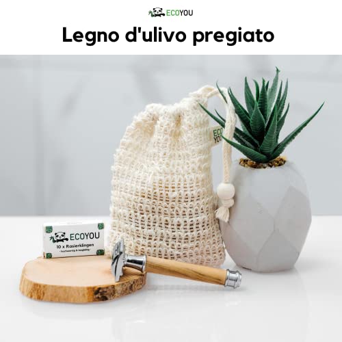 EcoYou Rasoio con Manico in Legno d'Ulivo - Rasoio di Sicurezza per Donna, Rasatura Tutto il Corpo, Gambe, Ascelle, Inguine - EcoSostenibile, Imballaggio Plastic Free, Lama Intercambiabile - 10 Lame