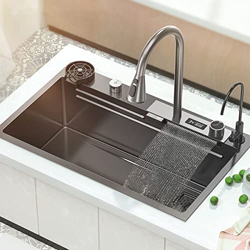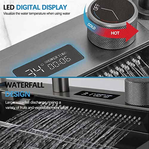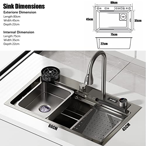 ECTbicyk Lavello da cucina a cascata in acciaio inox, lavello da cucina nero, con rubinetto estraibile e altri accessori (display digitale, 80 x 45 cm)