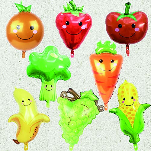 MOLTI USI: Un set contiene 8 pezzi, Fragola 48 cm x 71 cm, Banana 48 cm x 71 cm, Uva 51 cm x 70 cm, Pomodoro 55 cm x 71 cm, Carota 41 cm x 80 cm, Mais 50 cm x 71 cm, Broccoli 54 cm x 76 cm, arancia 51cm x 74cm. Si adattano non solo per festa di compleanno, ma si applicano anche a varie occasioni di celebrazione o decorazione, come feste di scuola, feste notturne, feste di laurea, matrimonio e feste di fidanzamento, decorazioni della vita quotidiana...