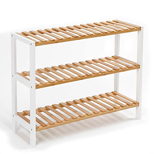 Edaygo Scarpiera da ingresso con Seduta Panca Scaffale 3 Ripiani per 12 Paia di Scarpe, 55 x 70 x 25 cm (A x L x P), Bambù e Legno Bianco