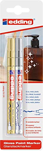 Edding 751 marcatore a vernice lucida - oro, argento - confezione da 2 - punta rotonda 1-2 mm - pennarello indelebile per vetro, pietra, legno, plastica, carta - impermeabile, alta copertura