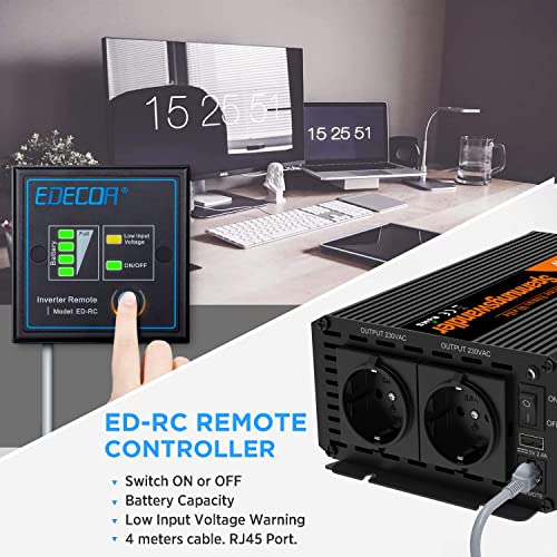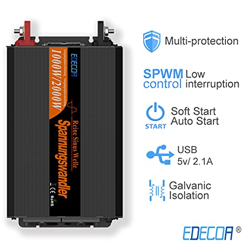 EDECOA inverter 12v 220v onda pura 1000w convertitore di tensione USB e telecomando power inverter di potenza per auto camper pannello solare Transformatore