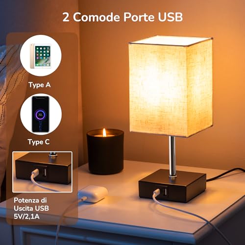 EDISHINE Lampade da Comodino Touch Set di 2, con Porta di Ricarica USB-A e USB-C, Lampadina LED E27 Inclusa, 3 Luminosità per Camera da Letto, Soggiorno, Hotel, Paralume in Lino