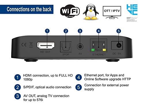 Sistema operativo Linux, IPTV m3u Supporto, YouTube, Stalker TV, WebTV, Dailymotion, Shoutcast, Tempo, Media Player, Xtream, Vimeo