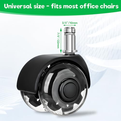 Facile da installare: l'installazione è semplice e veloce. Le rotelle per pavimenti duri da 10 mm possono essere utilizzate come ruote sostitutive per la maggior parte delle sedie e degli sgabelli da lavoro. Basta estrarre le vecchie ruote della sedia e inserirle. Quindi far scorrere le guide delle nuove ruote della sedia nelle fessure fino a quando non saranno collegate saldamente. Si rimuove e si installa in 5 minuti senza attrezzi.