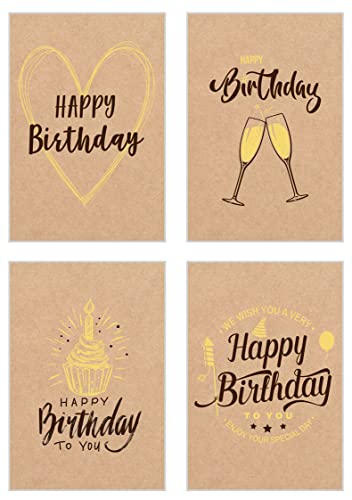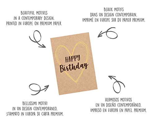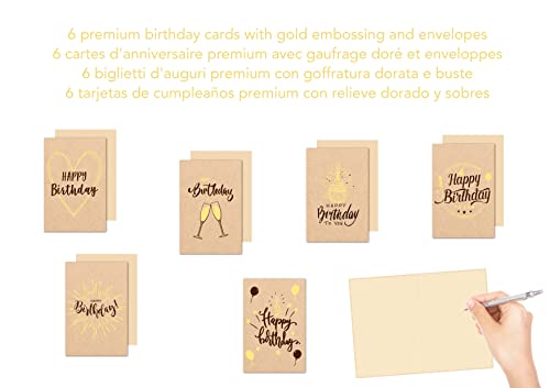 Edition Seidel Set di 6 biglietti di auguri di compleanno di alta qualità con stampa dorata e busta. Carta kraft con scritta "Happy Birthday" per compleanno, uomo e donna