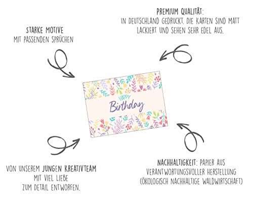 ⭐️ Alta qualità: tutti i biglietti sono laccati opachi e hanno un aspetto molto elegante. Carta di alta qualità (350 g/mq) stampata in Germania. Biglietti di alta qualità. Qualità offset. Le dimensioni dei biglietti sono 10,5 x 14,8 cm. La parte posteriore è facile da scrivere (testo proprio o scritta).