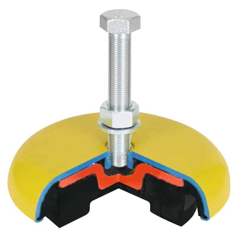 Sistemi antivibrazioni per macchine. Il disaccoppiamento di macchine sensibili alle vibrazioni e articoli di arredo migliora la sicurezza e la precisione dei processi. Gli elastomeri impiegati ammortizzano vibrazioni meccaniche, oscillazioni e urti e garantiscono risultati ottimali con un ridotto inquinamento acustico. Tutti gli elementi sono livellabili e montabili senza fatica. Supporti in metallo ed elastomero, struttura compatta con sistema di livellamento integrato mediante una vite di regolazione centrale. Uso: Per l'installazione di macchine senza ancoraggio al suolo. Nota: Per sollecitazioni elevate e applicazioni speciali sono disponibili su richiesta altri elementi. Elementi a molla pneumatica disponibili nello shop online al n. art. 086003 Dim. SLM1 − SLM12. Dati tecnici Tipo di prodotto Supporto antivibrazioni ⌀ Filettatura G M16×1,5 Campo di livellamento massimo (compensazione altezza Ni), mm 20 Lunghezza vite S, mm 100 Altezza H, mm 35 Portata massima, kg 3.000 Carico