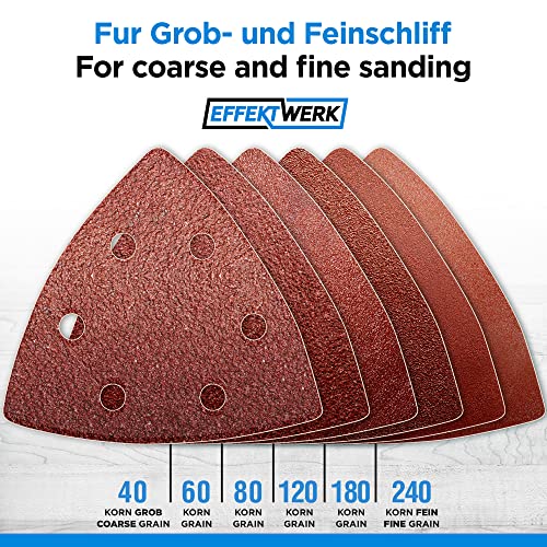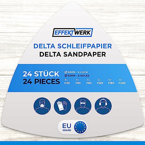 EffektWerk Carta vetrata Delta (confezione da 24, 6 fori), platorelli abrasivi triangolari 93 x 93 x 93 mm per levigatrici mouse, grana multipla (40, 60, 80, 120, 180, 240)
