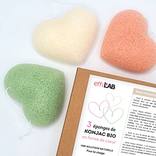 EffiLAB | Confezione di 3 spugne di Konjac biologiche a forma di cuore in diversi colori | Set di 3 spugne cuori| Spugna vegetale naturale, pulizia delicata, amore..