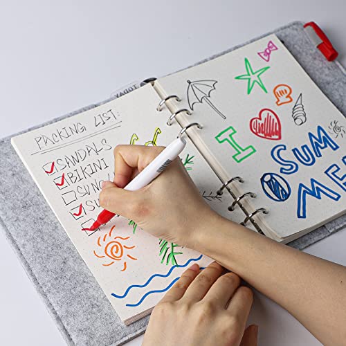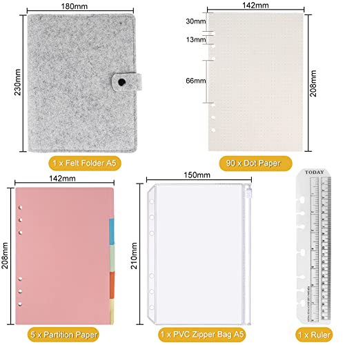 ✅【 】Il quaderno contiene 90 fogli di carta tratteggiata, 5 divisori, 1 tasca con zip in PVC A5 e 1 righello morbido in plastica trasparente. La copertina in feltro è riutilizzabile e le cinghie a scatto sono leggermente più lunghe in modo da avere più spazio per riempirla. Se è necessario sostituire la carta, controllare la spaziatura dei fori della carta per assicurarsi di acquistare la carta corretta con la giusta spaziatura dei fori.