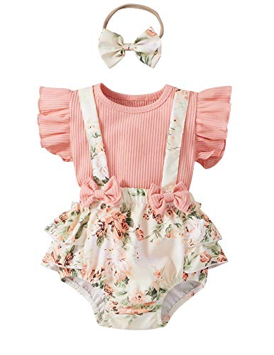 Eghunooze, Set di 3 pezzi composto da una tutina per neonata, con top con maniche con volant, pantaloncini con bretelle e motivo a fiori e fascia per capelli estiva, rosa, 18 mesi