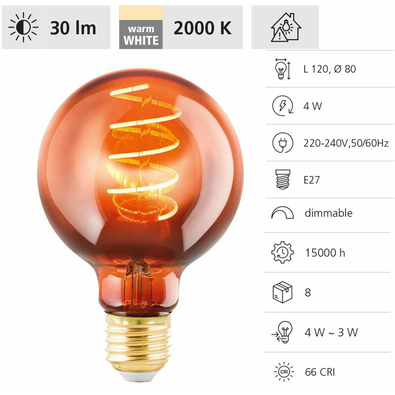 LED LAMP LED E27 L: 12 cm Ø: 8 cm Dimmbar 2000k Dimensioni in mm: Lunghezza: 120, diametro: 80 Peso in kg: 0.044 Tipo di agente luminato/versione: E27 Iluminants contengono: Sì Prestazioni massime in Watt: 1x4w Colore della luce in Kelvin: 2000k Colore della luce: Extra Warm White Classe di protezione: IP20 Dimmabile: Sì Materiale vetro/picchi: Glass Colore di vetro/ombrello: Copper - colorato