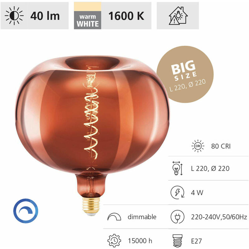 Lampade E27-Led-Apple Big Times L: 22 cm Ø: 22 cm Dimmbar 1600K Forma extra grande, colori e superfici moderni ›Filamenti dritti e a spirale › L'occhio -catcher nella tua zona giorno ›Energia -Tecnololgia del filamento a LED a LED Dimensioni in mm: Lunghezza: 220, diametro: 220 Peso in kg: 0.3 Tipo di lampada/versione: e27 Contenuto: Sì Prestazioni massime in watt: 1x4w Colore della luce in Kelvin: 1600k Colore della luce: Extra Warm White Classe di protezione: ip20 Dimmbar: Sì Materiale vetro/picchi: vetro vetro/ Colore ombrello: Colori di rame Informazioni aggiuntive: non adatto per l'illuminazione generale
