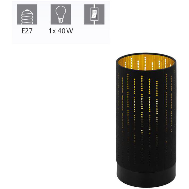 Collezione Varillas LA LAMPADA CHE OFFRE UNA LUCE SUGGESTIVA E UN EFFETTO CHIC La lampada da tavolo VARILLAS è composta da una base rotonda in metallo nero e da un paralume cilindrico in stoffa nera.. All'esterno e dorata all'interno e rivestito di pellicola trasparente. È possibile accendere e spegnere la luce tramite un interruttore presente sul cavo. I ritagli verticali sul paralume creano un particolare gioco di luci e ombre quando la luce è accesa. É adatta a qualsiasi stile di arredamento e a qualsiasi ambiente, che si tratti del soggiorno, della camera da letto o del corridoio. La lampadina, con attacco E27, non è inclusa nella consegna.