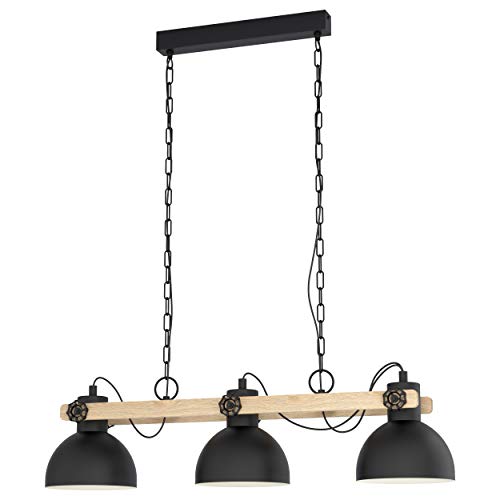 EGLO Lampada a sospensione Lubenham, Lampada Vintage a tre dal design industriale, lampadario retrò in acciaio e legno, nero, marrone, E27