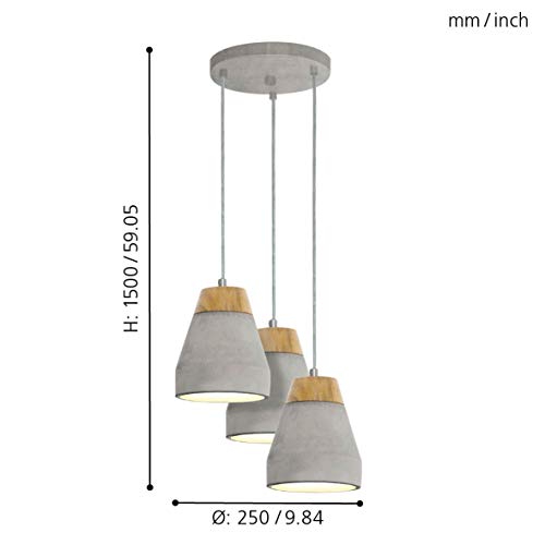 EGLO Lampada a sospensione Tarega, lampada a sospensione in cemento a 3 punti luce, acciaio, legno, cemento, grigio, marrone, E27, diametro 250 mm