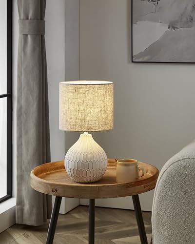 La lampada da comodino decorativa con base sferica in ceramica, motivo boho di tendenza e paralume cilindrico in tessuto marrone chiaro si adatta ideale agli interni moderni ed è una chicca per gli amanti dei dettagli così come per tutti gli appassionati di modelli e strutture