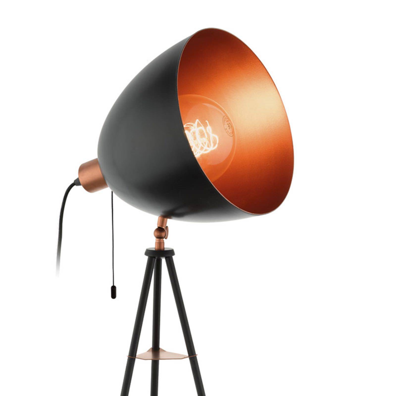 Lampada da terra a treppiede Chester con dettagli in rame La lampada da terra Chester è assolutamente di tendenza sia per il treppiede che per la combinazione di colori, nero satinato e scintillante rame. Il paralume metallico a calice possiede un comodo interruttore a strappo con cui si accende direttamente la luce. Il lato interno del paralume in color rame si esalta accendendo la luce e diffonde un'atmosfera calda e accogliente.