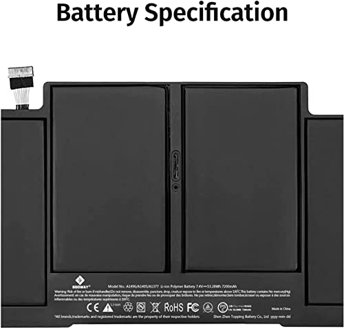 Compatibilità: la batteria per laptop EGOWAY A1405 A1496 A1377 è compatibile con Mac Book Air A1466 (metà 2012, metà 2013, inizio 2014, inizio 2015 e 2017), A1369 (fine 2010, metà 2011), MC503LL / A, MC504LL / A, MC965LL / A, MC966LL / A, MD231LL / A, MD232LL / A, MD760LL / A, MD761LL / A, MD760LL / B, MD761LL / B, MJVE2LL / A, MQD32xxx / A, QD52xX/A (per ulteriori informazioni consultare la descrizione del prodotto)