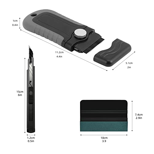 Pacchetto incluso e dimensioni: 1 x spatola vinile 10x7,5 cm, 1 x Taglierino Cutter (10 lame di ricambio incluse), 1 x Raschietto.