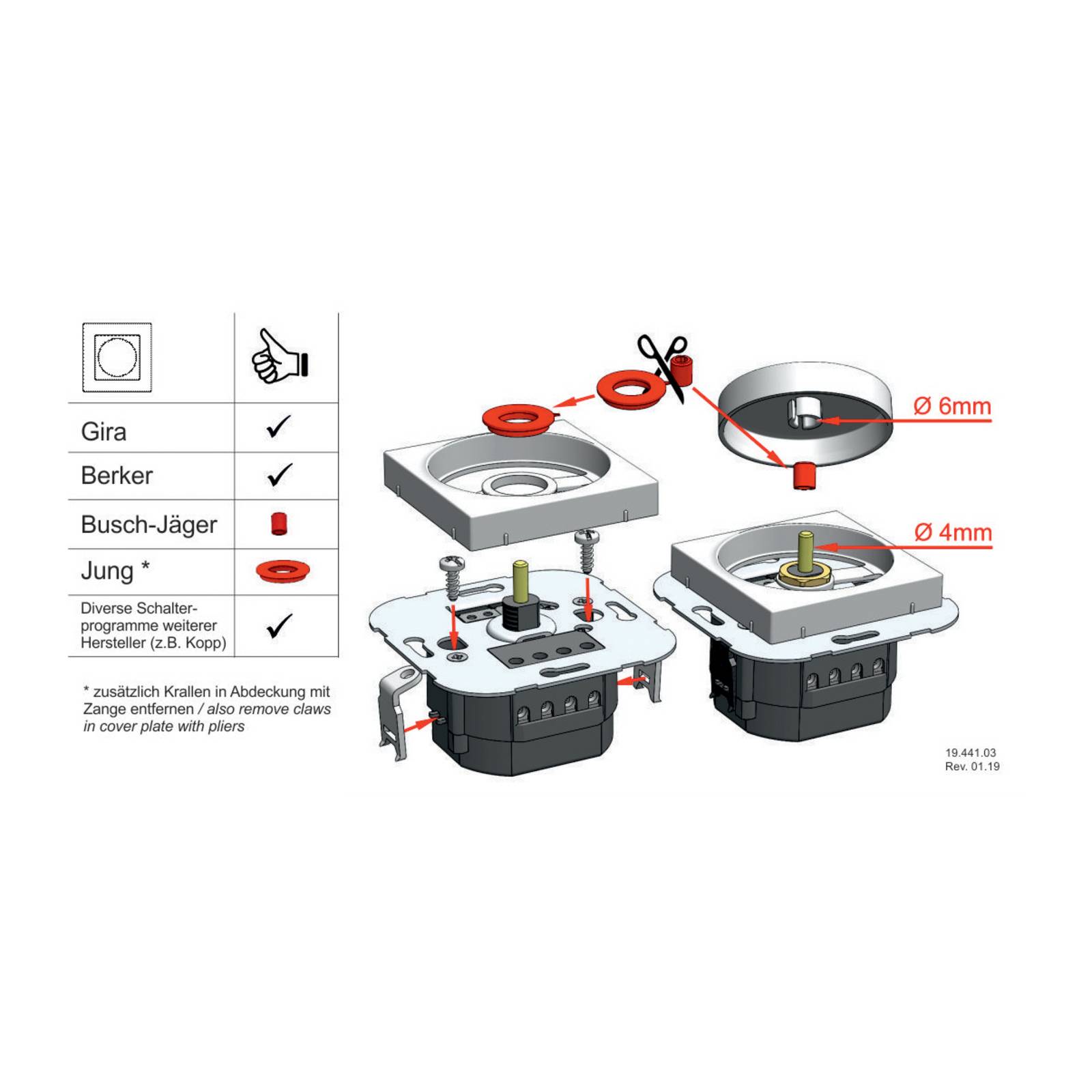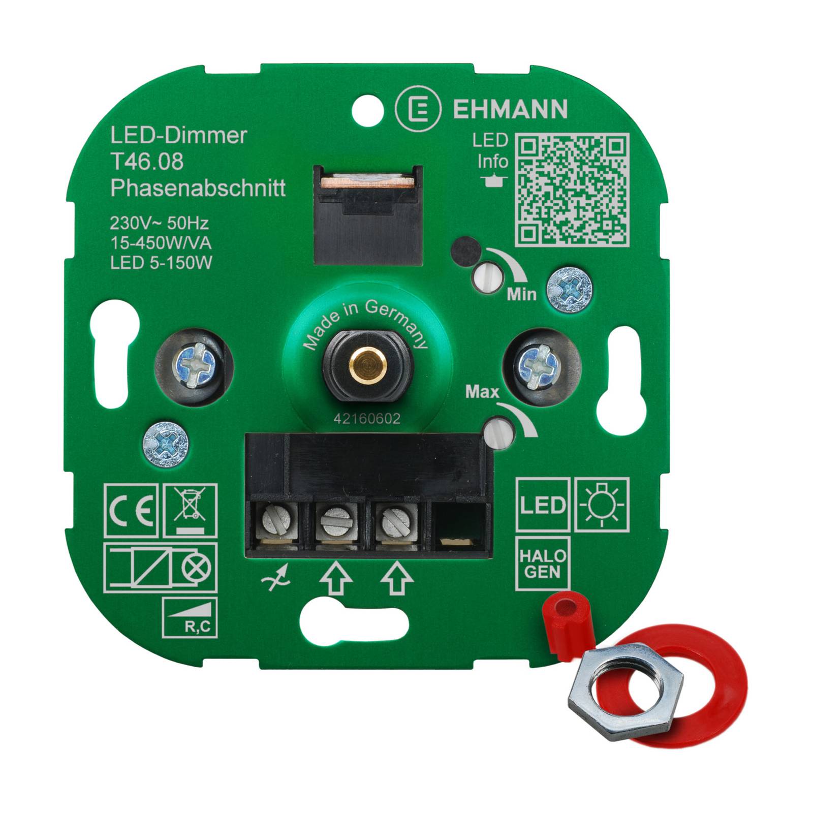 Dimmer rotativo LED T46 per montaggio a incassoCompatibile con molti sistemi di commutazione comuni e per molte lampade e LED comuni, il dimmer LED da incasso T46 è di impiego universale. La tecnologia silenziosa integrata contribuisce a garantire un funzionamento silenzioso e un'opzione di ottimizzazione della gamma massima contribuisce a un utilizzo senza preoccupazioni. Ehmann, azienda con sede in Assia, offre molti vantaggi. Da un lato, Ehmann promette un controllo al 100%, dall'altro una lavorazione di alta qualità e una funzionalità affidabile - Made in Germany dimmerazione affidabile e indipendente dal produttore - adatto per LED a filamento dimmerabile, driver LED, lampade LED, lampade a incandescenza e alogene HV trasformatore elettronico - opzioni di ottimizzazione per una dimmerazione senza sfarfallio delle lampade LED nella gamma massima - tecnologia silenziosa per un funzionamento assolutamente silenzioso - nessun consumo in stand-by grazie all'interruttore on/off reale - protezione da cortocircuito e sovraccarico e protezione da sovratemperatura con riattivazione automatica - consente l'utilizzo di gamme di interruttori comuni, ad es.Busch-Jäger, Gira, Berker, Jung e molti altri l'attuale raccomandazione della sorgente luminosa a LED può essere richiamata in qualsiasi momento tramite il codice QR nella scheda tecnica- Lavorazione di alta qualità e funzionamento affidabile