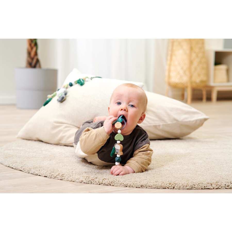 Dettagli del prodotto: Età: da 0 mesi Eichhorn La catena succhietto Baby HiPP di alta qualità in legno di faggio ha diversi stimoli tattili. Le diverse perle tattili e l'elemento in peluche diventano un'esperienza sensoriale per le manine e un richiamo per gli occhi Con clip per agganciare il ciuccio La catena portaciuccio è stata realizzata in conformità alla norma DIN EN 12586:2007 (standard per i portaciuccio) Dimensioni e materiale: Dimensioni (lunghezza): 19 cm Materiale: FSC® 100%, legno di faggio, silicone, peluche, metallo eTB/inserto Avvertenze e istruzioni di sicurezza: ATTENZIONE! Controllare il portaciuccio prima di ogni utilizzo. Gettarlo immediatamente al primo segno di danni o difetti! Non allungare mai il portaciuccio! Non attaccare mai il portaciuccio a corde, cinghie, lacci o parti sciolte degli indumenti. Il bambino potrebbe soffocarsi. Quando si pulisce la catena portaciuccio, assicurarsi che venga risciacquata con acqua tiepida e sapone neutro, lasciarla asciugare all'aria ed evitare detergenti aggressivi che potrebbero danneggiare la catena portaciuccio.