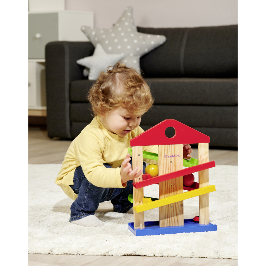 Dettagli del prodotto: Età: da 12 mesi La coloratissima casetta di marmo di Eichhorn non può mancare nella stanza di nessun bambino. La casetta misura 25 x 12 x 34 cm e gli occhi dei bambini rimarranno a bocca aperta quando le palline rotoleranno dall'alto verso il basso su 5 binari. Le palline di legno colorate che rotolano suonano il campanello quando raggiungono di nuovo il suolo. Con 3 palline Dimensioni e materiale: Dimensioni da montato (lunghezza x larghezza x altezza): 25 x 12 x 34 cm Materiale: Legno naturale/colorato
