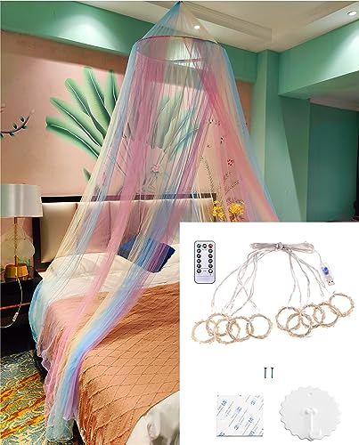 Eimilaly Principessa Arcobaleno baldacchino del letto con 250pcs luci bianche calde della tenda, baldacchino del letto per la decorazione della camera delle ragazze o festa a tema unicorno