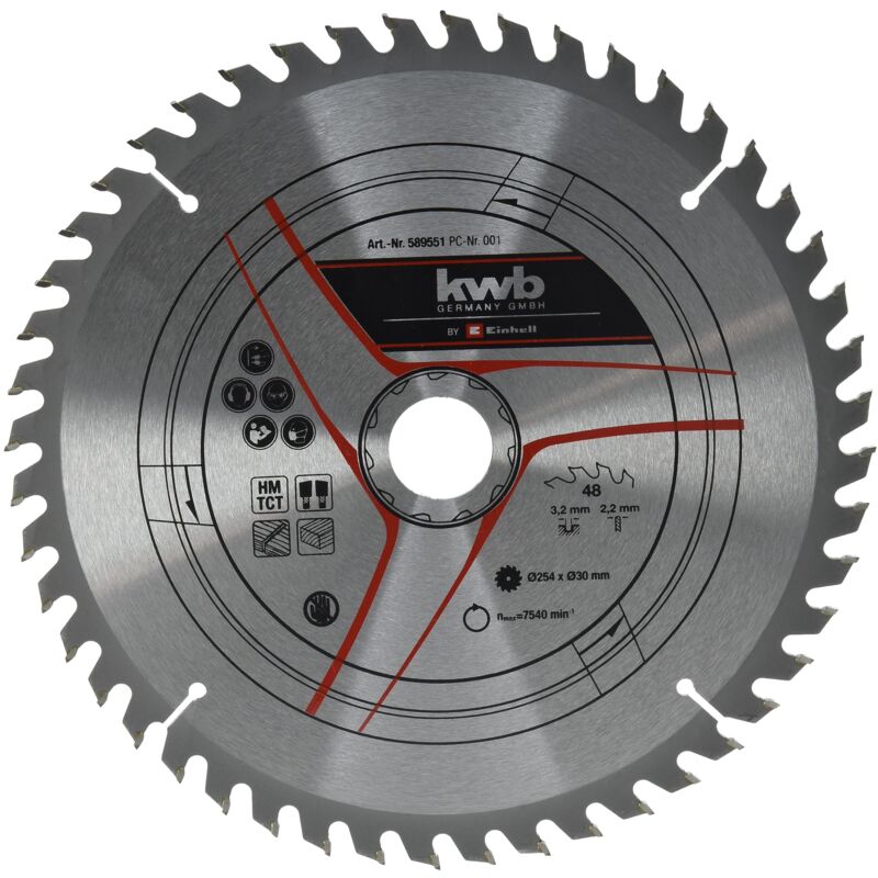 Lama in metallo duro (TCT) con 48 denti di sega, diametro lama 254 mm, diametro del foro 30 mm e spessore di 2,2 mm. Adatto per legno duro, di speroni e tenero, compositi di legno e PVC. Adatto per sega circolare da tavolo Einhell TC-TS 2025/2 eco, troncatrice TC-SM 254 e TC-SM 2531/1 U.