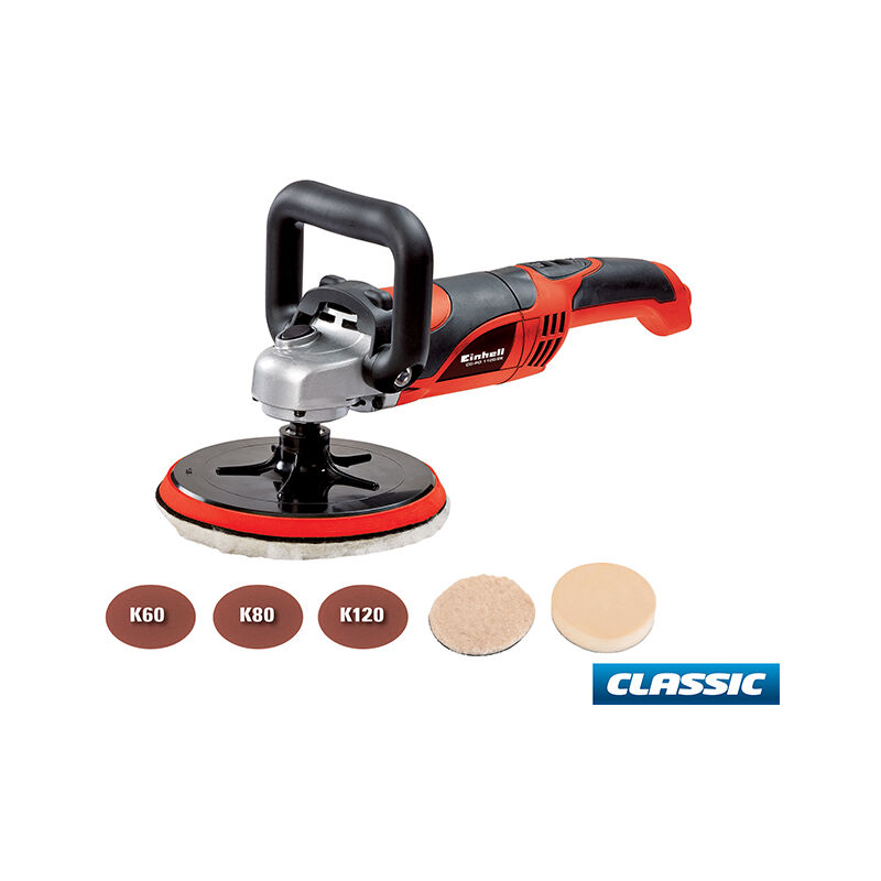 1100w di potenza - tensione 230v / 50Hz - velocità di rotazione 1.000-3.500 g/min. - platorello ø mm.180 - disco ø mm.180 - sistema elettronico per la regolazione del numero di giri - blocco del mandrino - facile e rapida sostituzione della carta abrasiva grazie al hook and loop - in dotazione: 1 platorello in espanso, 1 cuffia lucidante in materiale sintetico, 1 carta abrasiva grana 60, 1 carta abrasiva grana 80, 1 carta abrasiva grana 120 - peso kg.2,3