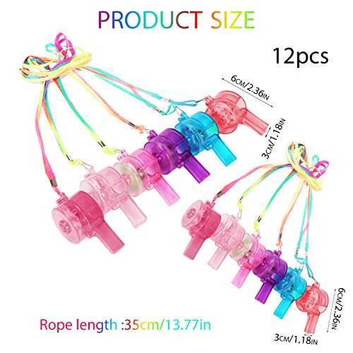 La confezione include: 12 fischietti luminosi. Ogni fischietto ha 3 colori lampeggianti alternativamente (rosso, verde e blu). Piccoli giocattoli delicati portano molto divertimento ai bambini.
