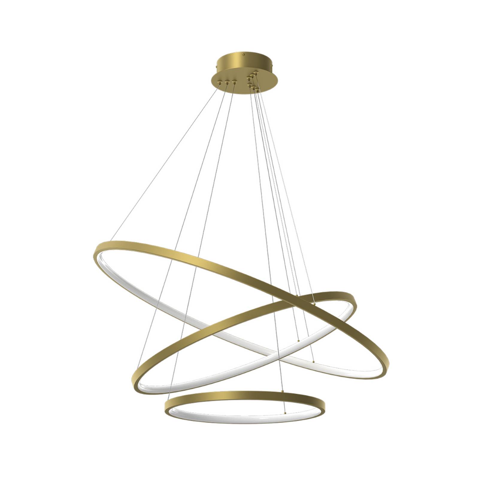 Elegante lampada a sospensione Rotonda LED con tre anelli dorati La lampada a sospensione Rotonda LED è dotata di tre anelli di diverse dimensioni, al cui interno sono installati LED bianchi neutri dietro diffusori satinati. L'altezza di sospensione e l'inclinazione degli anelli possono essere regolate durante l'installazione accorciando i fili di sospensione. Ideale per ambienti prestigiosi in aree pubbliche/commerciali.