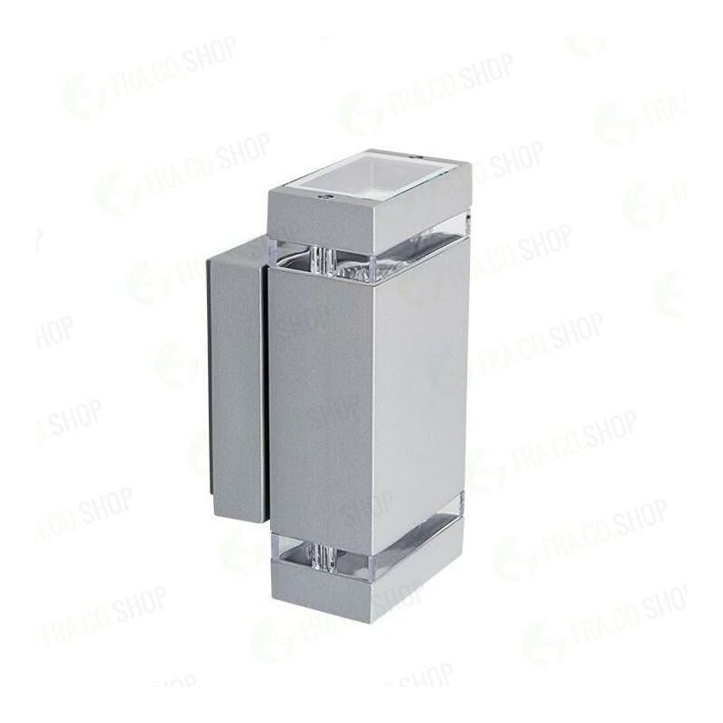 Lampada installazione a parete da esterno interno, con doppia luce, lampadine non incluse.caratteristiche:.alimentazione 220-240 volt.attacco lampadina 2 x gu10.grado di protezione ip44.colore ARGENTO SILVER.attacco lampadina gu10.marchio cedimensioni:.larghezza 110 mm.lunghezza 65 mm.altezza 235 mm
