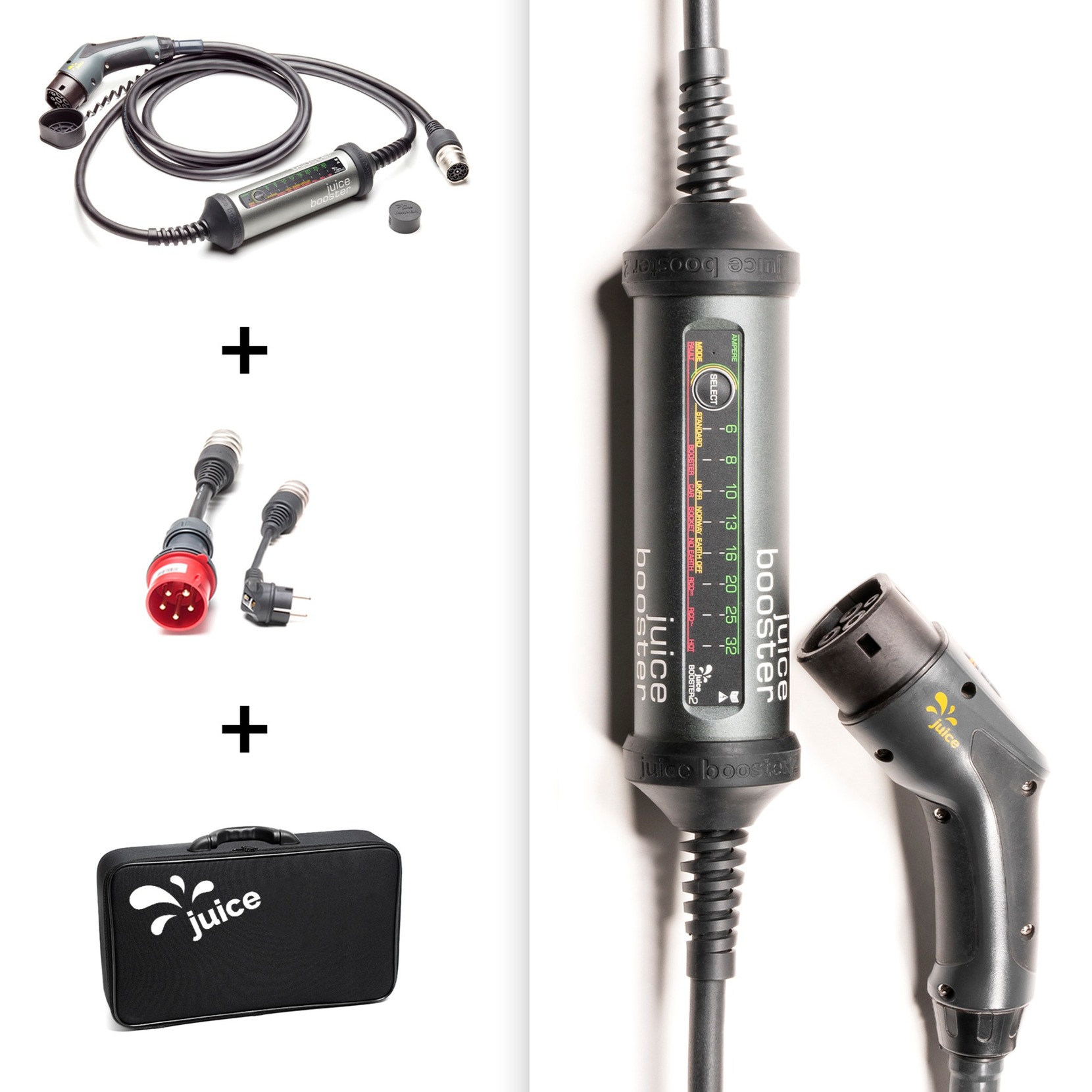 Juice BOOSTER 2 è la wallbox mobile per tutto il mondo! Con esso basta portare con sé la wallbox. Dove c''è elettricità, è possibile caricare. Non ci sono più preoccupazioni per la portata. Con JUICE BOOSTER 2 puoi sempre ricaricare il più rapidamente possibile, automaticamente correttamente e nel modo più sicuro possibile, indipendentemente dalla connessione di alimentazione. Grazie alla funzione 3 in 1, JUICE BOOSTER 2 può essere utilizzato non solo come stazione di ricarica mobile (ICCPD), ma anche come wallbox (con montaggio a parete opzionale) o cavo di tipo 2 (con adattatore di tipo 2 opzionale). Grazie alla selezione completa di adattatori per tutte le comuni prese domestiche, industriali ed EV, è possibile caricare in patria e all''estero. Il rilevamento automatico dell''adattatore regola in modo intelligente la corrente. Il calcolo noioso o la conversione manuale della corrente vengono eliminati. Utilizzando il pulsante Seleziona su JUICE BOOSTER 2, questo può ancora essere ridotto a icona manualmente, se lo si desidera. Il set di base tedesco viene fornito con due diversi adattatori [CEE32 3-phase (Global), CEE 7/7 (EU) / Protective Contact (DE)].