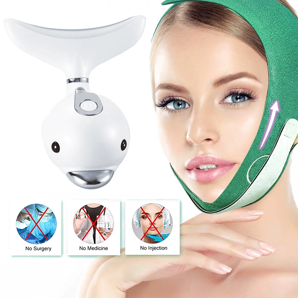 Elastic Face Slimming Bandage+Photon Therapy Heating Wrinkle Removal Machine 3 Color Led Facial Neck Massager Remove Double Chin
